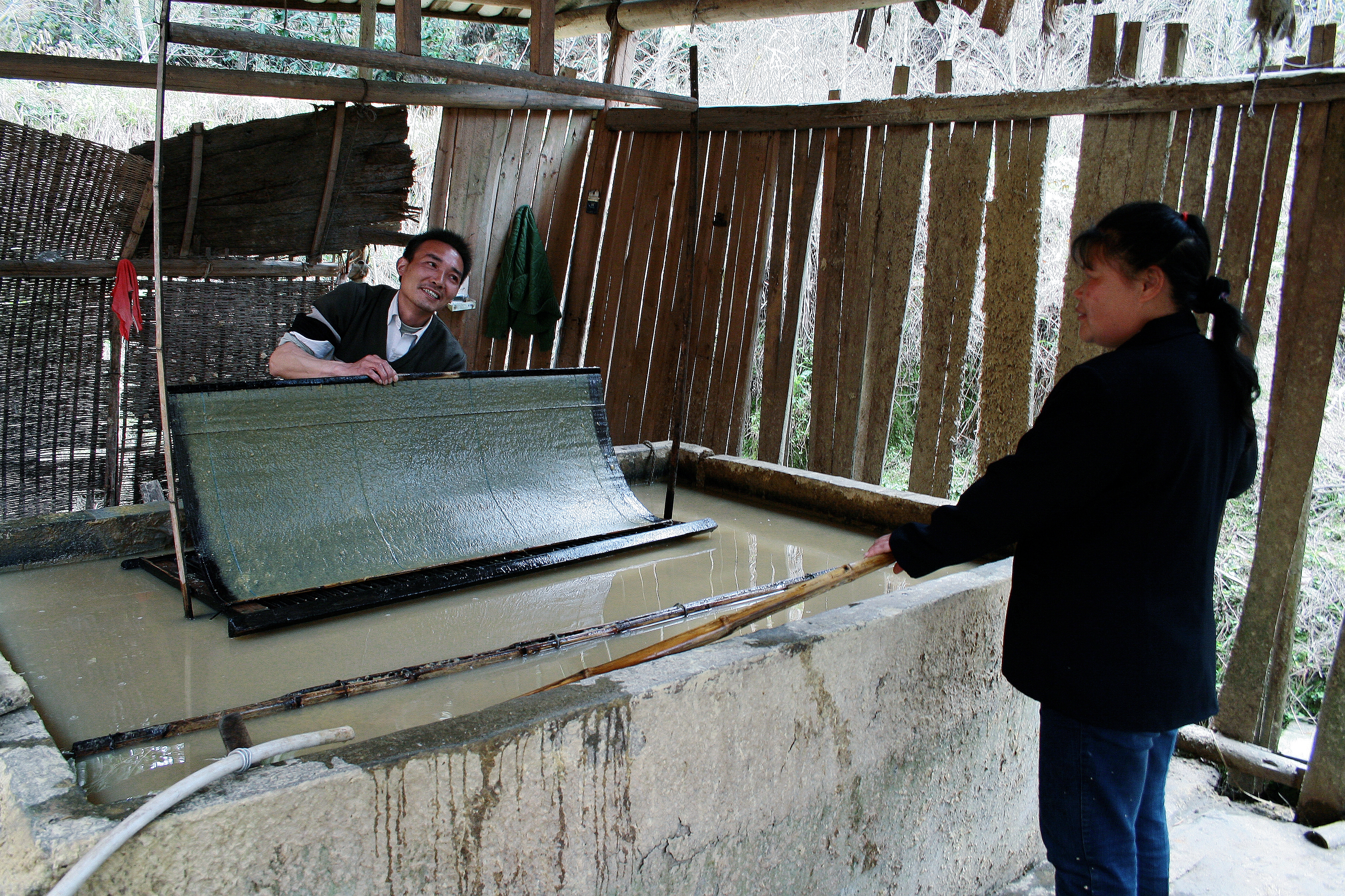 万载是江西毛竹重点产区,丰富的资源为表芯纸的生产奠定了扎实的基础。表芯纸又称土纸,是万载三大特产之一。据县志记载:万载自唐、明以来,就有客家人逐渐迁入,居于山区,伐木烧炭,育竹造纸。到上世纪二十年代初,万载有纸槽500余个,纸棚工人2万余人,年产土纸40余万担。万载“纸棚山歌”历史悠久,自明代万载有表芯纸生产开始,就产生了纸棚山歌。这种纸工谣在劳动现场纸棚中现编现唱,想唱就唱,是纸棚工人在劳动中不可或缺的自娱自乐的文化形式。他们在歌唱中或期盼丰收,或宣泄苦闷,或打情骂俏,或诉说心声。比喻贴切,自然幽默,诙谐成趣。一首纸工谣一般由四句组成,每句七个字或加上衬词。在山冈上,在竹林里,纸棚工人你唱我和,使艰苦的劳动变得比较轻松愉快,情绪得到宣泄。