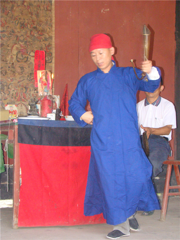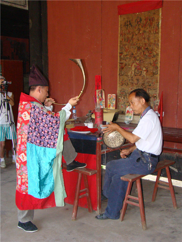 在民间乐器伴奏下,表演程序视具体情况而定,一般是起师、请灶、奏表、治病、解煞、敬师、祭坛、和盘、收魂、超度、谢师、送神等。