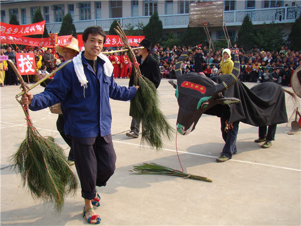 灯彩“渔樵耕读”又名“春牛花灯”,源于湖南的送“春牛”。三都镇张以发在送“春牛”形式上进行了改造、充实,用竹篾扎成牛头,牛尾状,蒙上黑布或黑纸系在身上,每至一家便唱几段花鼓小调,祝愿五谷丰登、六畜兴旺的基础上,增加了“渔翁”“樵夫”“农夫”“读书郎”组成“渔樵耕读”灯彩,后又加了一旦一丑,配上民间小调,载歌载舞,一旦一丑为灯彩主角,一问一答,各角色有鲜明性格特色,丑角才思敏捷、机灵调皮,旦角聪颖坦率、热情活泼,渔翁驼背拐脚、滑稽可笑,樵夫农夫插秆打浑、风谐诙谐,读书郎文质彬彬、纯朴敦厚,各角色均有各自规定的舞步。