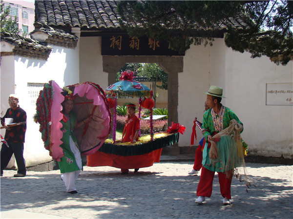 乐器是二胡、笛子、唢喇、中鼓、大小锣、钹;道具、唱词均用铜鼓话。