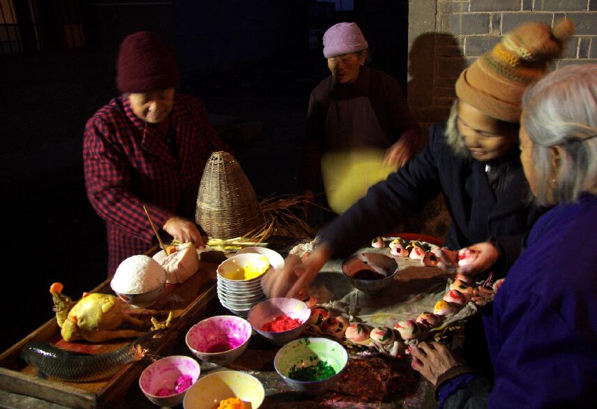 “禾堆饼”须在正月十四前做好、摆好。制作工艺:浸米—磨米粉(现机米粉)—溲团—揉饼—上色—蒸饼—堆饼。关键点为着色,村妇用黄紫红绿等色分别与少量米粉拌匀。在揉成小团的白米饼四周各点上几种颜色粉,用双手揉致颜色粉呈螺旋状散开,且互不串色。