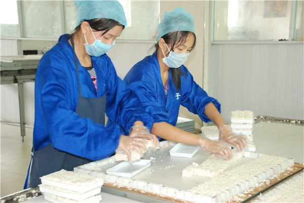 (5)摊凉搓散:把蒸好的糯米放在蔑盘中扒平冷却,经10小时后用木铲翻拌一遍,再经5至6小时后搓散,至不成团。