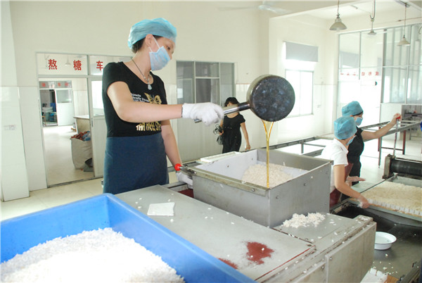 (8)拌料:将温度70℃至80℃的膨化冻米立即放入拌料器中,加入已熬煮好的饴糖、砂糖及配制好的辅料,按重量比5:1的比例进行拌料,拌至膨化冻米糖、辅料完全混合均匀为止。