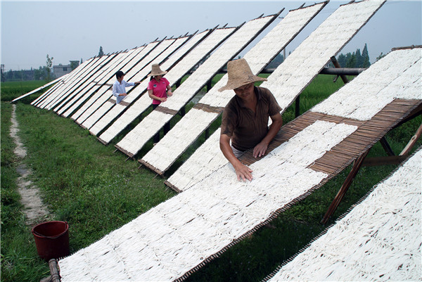 (5)晒粉、包装:将长约25厘米、宽约15厘米的木框模具放在竹匾上,再将冷却好的米粉丝放入模具中,移去模具,依次盘粉,盘好粉后放在太阳下晒干。注意应避免烈日曝晒,以防断条较多。待水分干至10-20%,即可收起用稻草绳扎好入库。