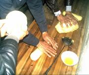 简介黄连麻糍是客家独有的一种传统糕点,也是每年小年前每家必做的一种风味食品。它具有软而不粘,绵韧而坚,味香色好,煎煮皆宜,饱食不腻的特点,是煮汤待客的主要原料,也是馈赠亲友的上乘礼品。黄连麻糍制作技艺包括:浸米、蒸糯饭、打米果、做米果、储藏这五道制作程序,黄连麻糍的的传统制作技术注重用料,以宜丰山区特有的黄连糯为主要原料,以纯天然的黄连柴、黄栀子、山泉为主要配料。而黄连糯米粒粗而短,粘性介于糯米和粳米之间,其产量甚低,且对土、水、肥及气候要求十分严格。稻米和黄连糯的特殊种殖技术以及制作要求均十分注重工艺中的传统技艺性。因此,黄连麻糍这一有文化底蕴的传统技艺能够得到认可并有效的保护,是对中华民族传统文化的保护和弘扬。黄连麻糍产地主要在黄岗、天宝、潭山、同安、花桥5个乡镇。黄连麻糍外表呈黄金色,长条形,长约8寸,宽、厚各为1寸。目前,当地乡民仍是按习俗年年腊月十五以后的打黄连麻糍。其制作工艺仍保持着原先的传统,产品则基本是过年待客及馈赠亲友之用历史渊源黄连麻糍为江西宜丰、潭山天宝、同安、花桥